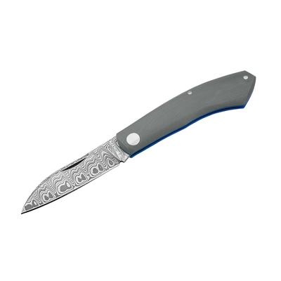 For this year's Damascus Annual Knife work for the first time with Ricardo Romano Bernandes. Carlo, whose family originally comes from Sicily, was born in Brazil, has been a knifemaker since 1990, and his craft is part of a tradition of knife making and sharpening that has been established for several generations. His design is based on the traditional Pen Knives and inspired us right away with its casual freshness. For the modern interpretation of a traditional knife form, the powder-metallurgical Damascus of the Swedish company Damasteel® seemed to us to be an appropriate blade material. The production of Damasteel® requires - even if the most modern technical means are used - just as much skill and experience as the hand-forging of steel. The purity and properties of Damasteel steel can be optimized to the extreme with complex combined processes. The self-supporting construction of laminated blue and gray G10 contrasts beautifully with the chosen "Odin Eye" pattern of Damasteel®. The simple yet all-time functional slip joint is a mandatory part of this type of knife. The size, weight, indestructible G10 scales and stainless Damasteel® make this collector's knife an excellent EDC at the same time. Delivered in a suspended display with certificate of authenticity and serial number. Strictly limited to 999 copies worldwide.