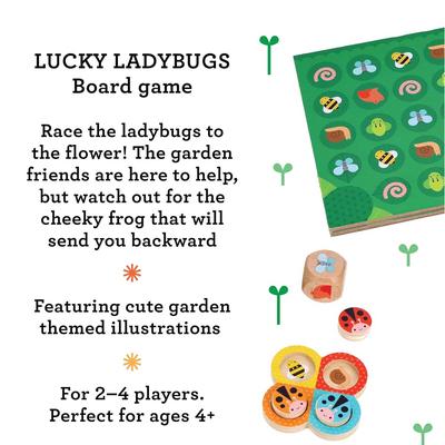 Simply roll the die to fly your ladybug across the board toward their flowery home. Your garden friends are here to help, especially the adorable aphid who gives you an extra turn. But watch out for the cheeky frog who will jump in the way of your journey! The first player to get their ladybug back home wins.