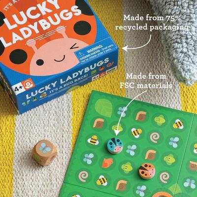 Inside the box, you’ll find four wooden ladybug characters, a wooden flower, wooden die, gameboard, and English, Dutch, French, German, Italian, and Spanish instructions. The game is plastic-free with everything made using FSC paper and wood, and the packaging is printed using 75% recycled materials and vegetable inks.