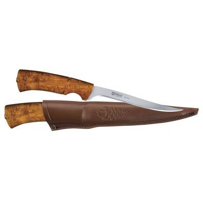 The Steinbit is a fillet knife with a thin flexible blade of non-laminated 12C27 Sandvik stainless steel. The elegantly curved curly birch handle looks good and fits well in the hand. A Nordic style leather sheath is included.