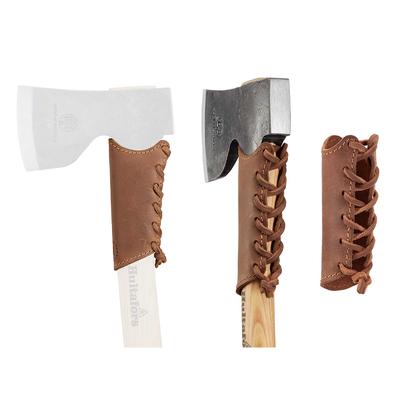 The overstrike guard (also known as a handle protector or an axe collar) is tied around the handle using the included leather cords.