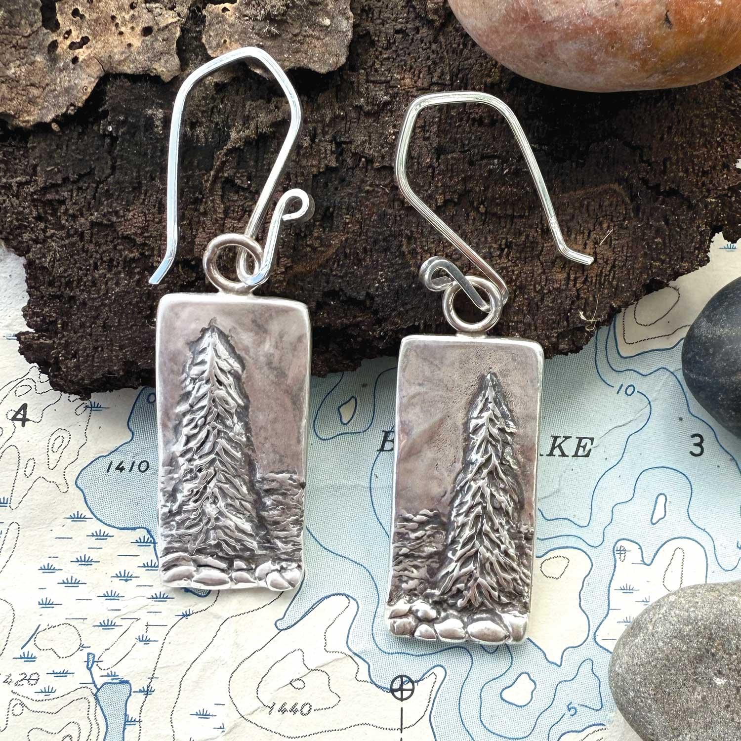 Tall pines celebrate our wilderness forests where adventure is new and memorable every season. 1/2” x 1” silver drops on sterling silver ear wires