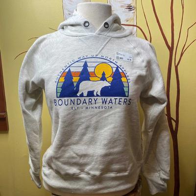 This youth hoodie features a forested scene with a bear in its design. Made with 60% cotton and 40% polyester materials.