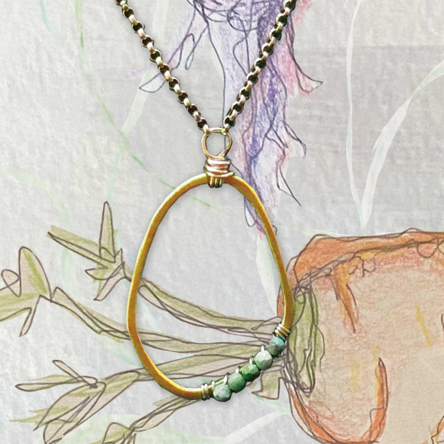 We've taken our best selling shape and wire-wrapped it for its very own pendant necklace. Our yellow bronze component is wire wrapped by hand with semi-precious gemstones. The pendant swings in the middle from an oxidized rolo style sterling silver chain.