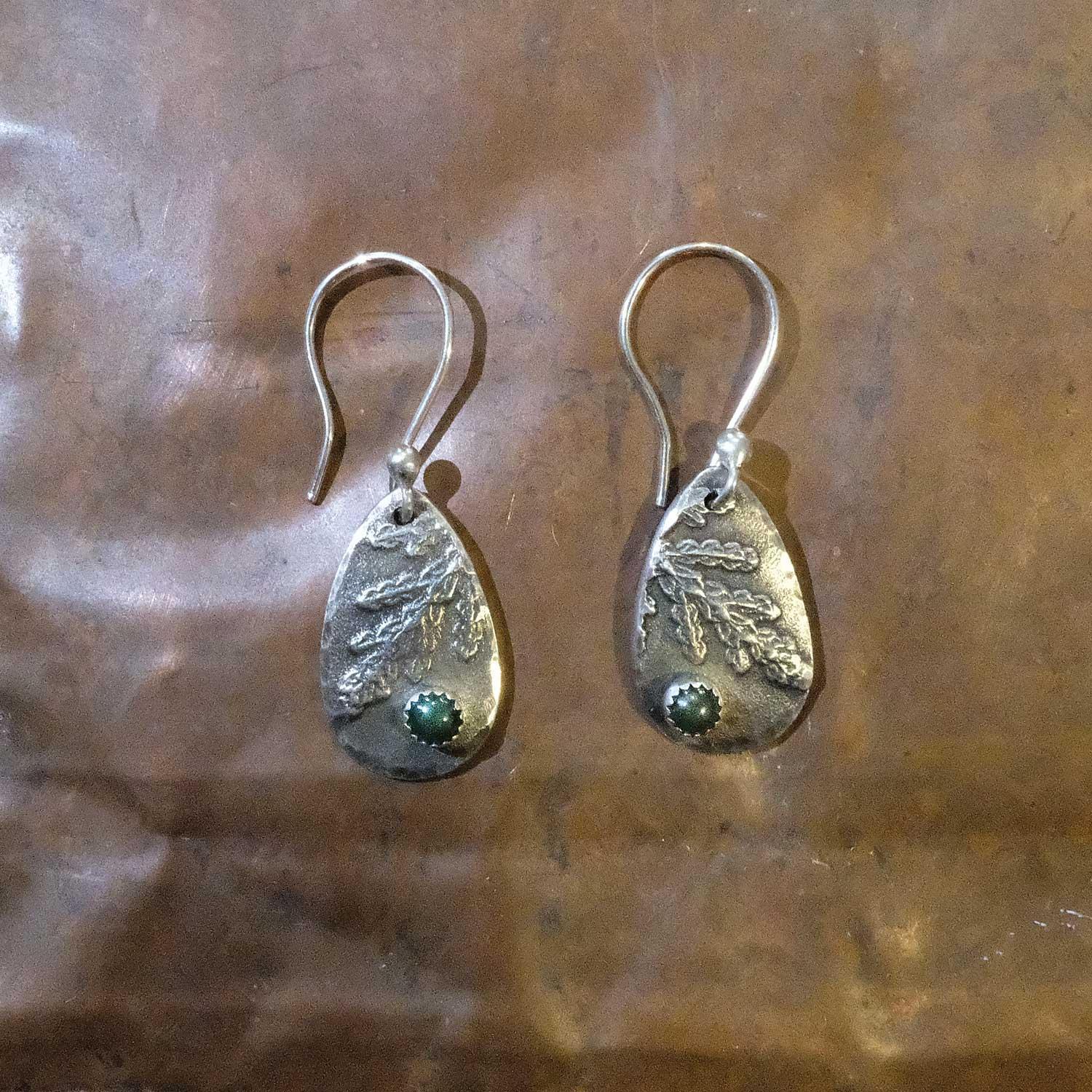 Cedar branches on sterling silver earrings measure 7/8” on sterling silver ear wires. Bezel soldered to the piece contains a 4 mm jade stone.