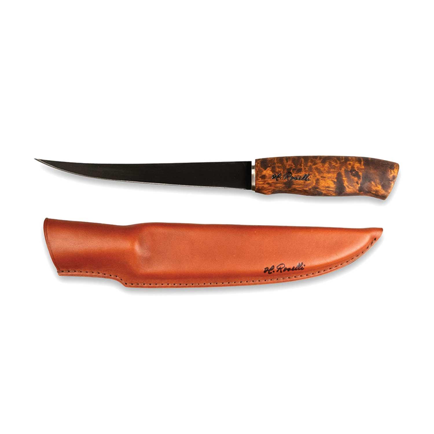 Powerful filet knife in premium carbon steel with a stained curly birch handle. The knife is ideal for larger fish, bread, meat and vegetables. Comes with a dark handmade leather sheath.