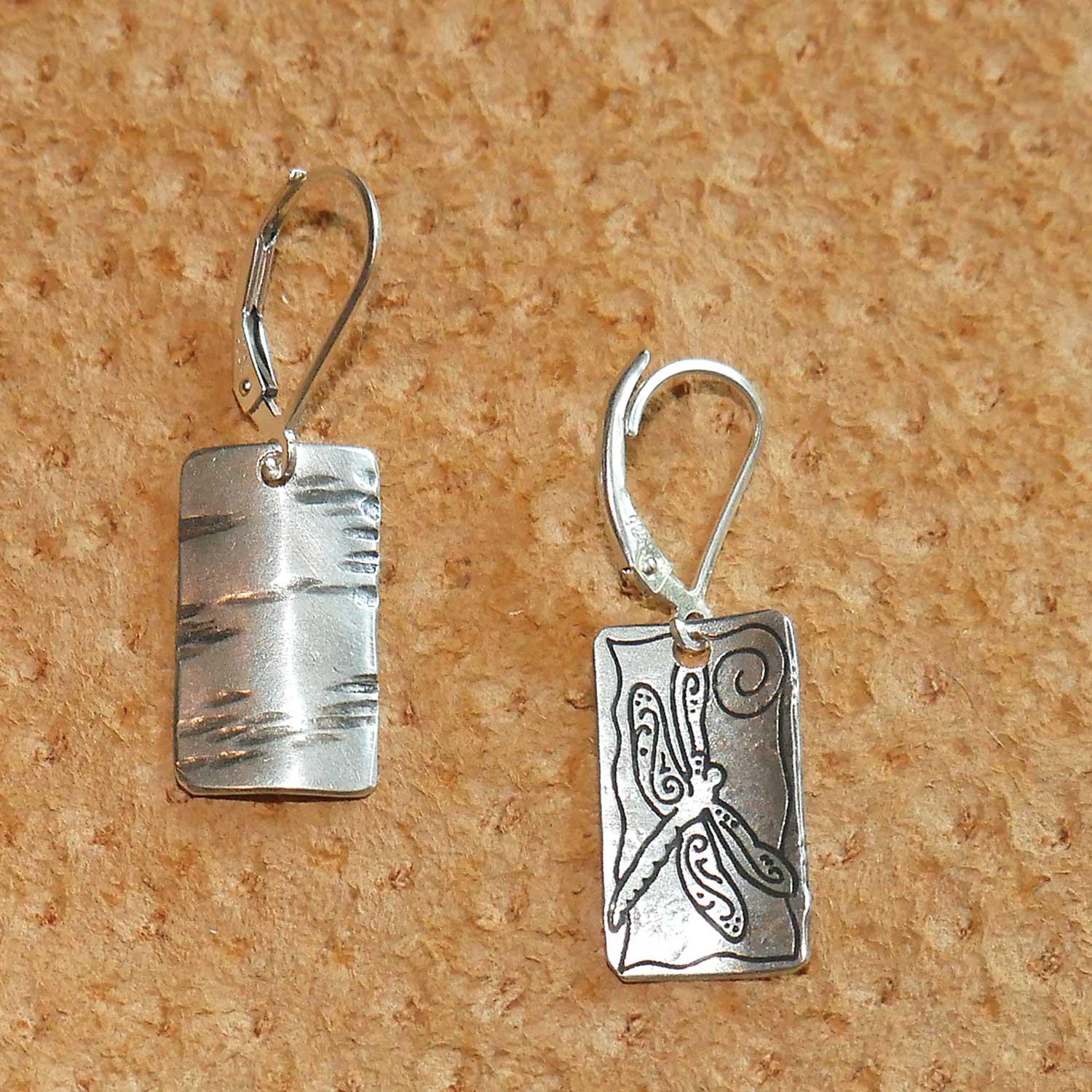Silver Birch and Dragonfly Earrings on reverse side. Lever back ear wires 1" long.