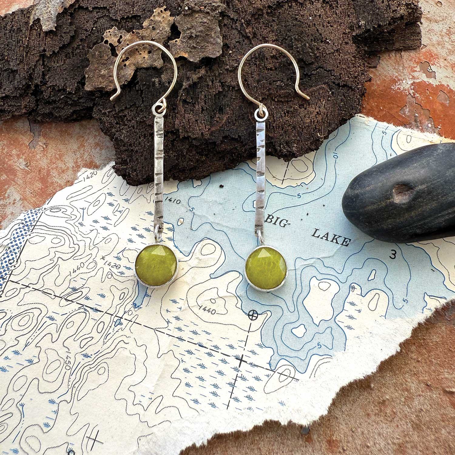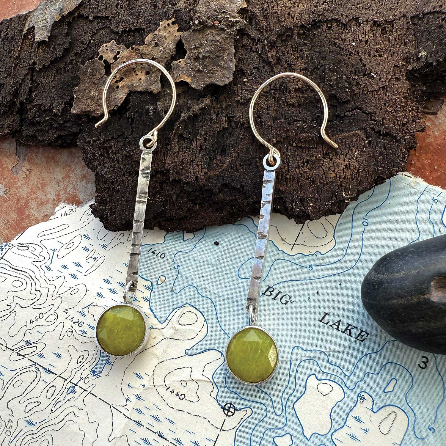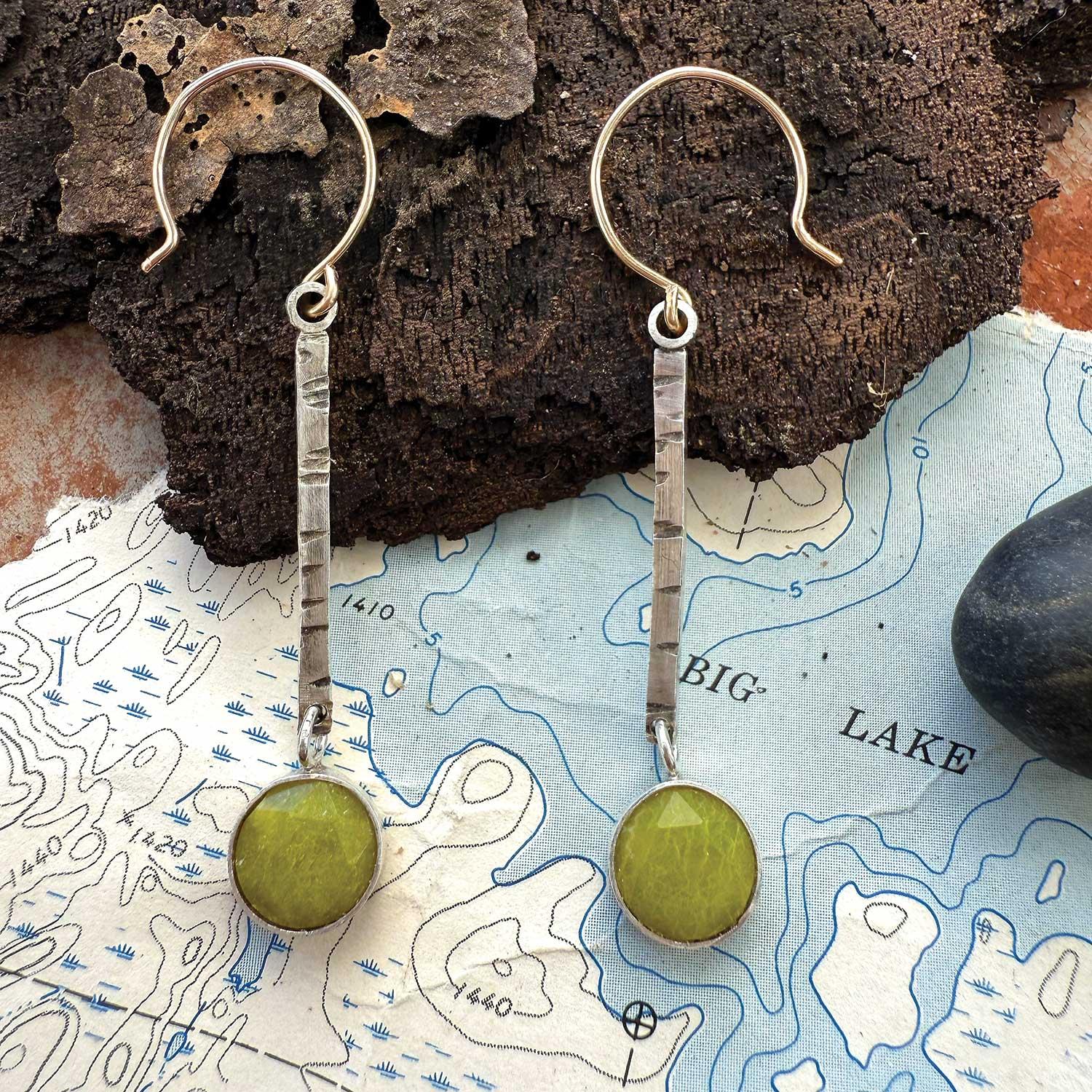 Birch 2mm wide silver bars with 8mm olive jade stone. 1 1/2” long on gold